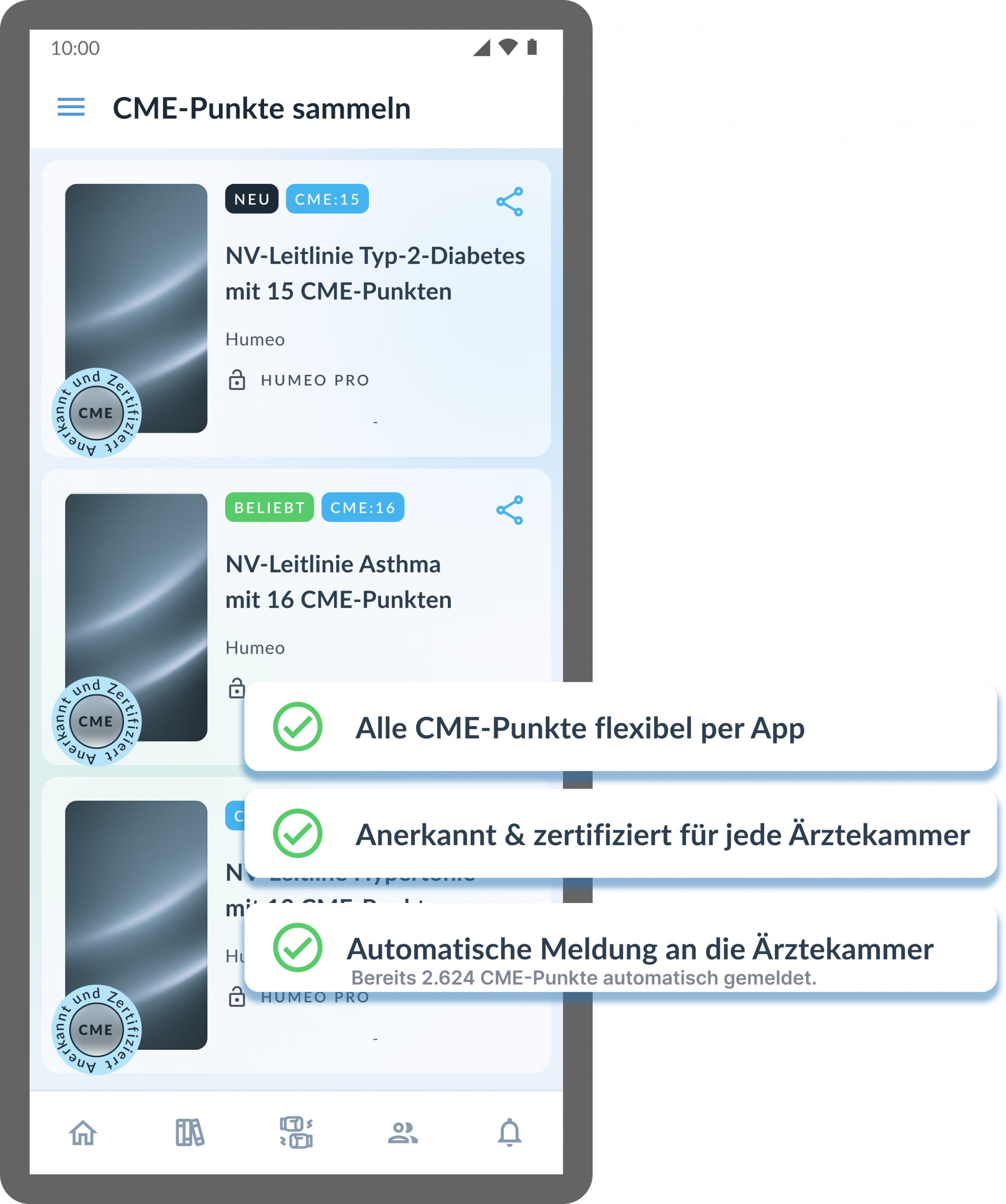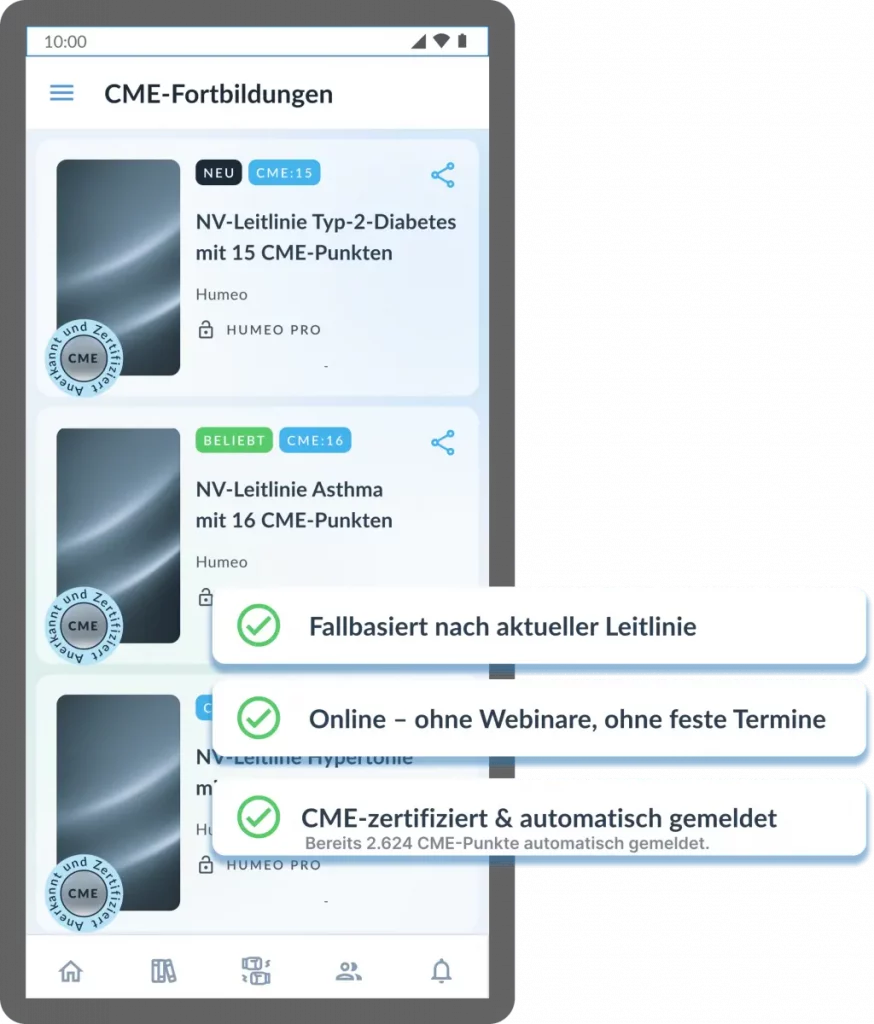 Seit Februar wurden 347 CME-Fortbildungen begonnen. Erledigen auch Sie Ihre CME-Module direkt in der App. Sie beantworten realitätsnahe Fallfragen nach Leitlinie; ab 70 % richtigen Antworten erhalten Sie Ihr Zertifikat automatisch. Die CME-Punkte werden digital an die zuständige Ärztekammer übermittelt, ohne zusätzlichen Aufwand. Kurze, klare Fallfragen ohne Seminarzeiten.