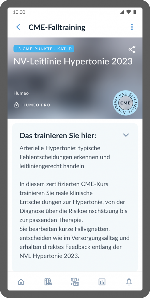 Humeo verbindet zertifizierte CME mit realen klinischen Entscheidungen aus der hausärztlichen Versorgung. So entsteht Fortbildung, die ohne Webinar, ohne feste Termine und näher an Ihrem Praxisalltag funktioniert.